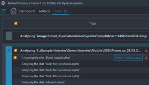 Belkasoft X requerirá el valor en base64. En la ventana Tareas de Belkasoft X, ubique la tarea de descifrado de señal y haga clic en el botón “Ingresar datos faltantes” allí:
