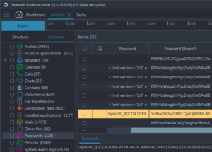 Durante la etapa de análisis, Belkasoft X extraerá la clave de cifrado de Signal del llavero y descifrará automáticamente los datos de Signal. Después de extraer el sistema de archivos completo de iOS, aparecerá el nodo ‘Contraseñas’ en la ventana Artefactos: