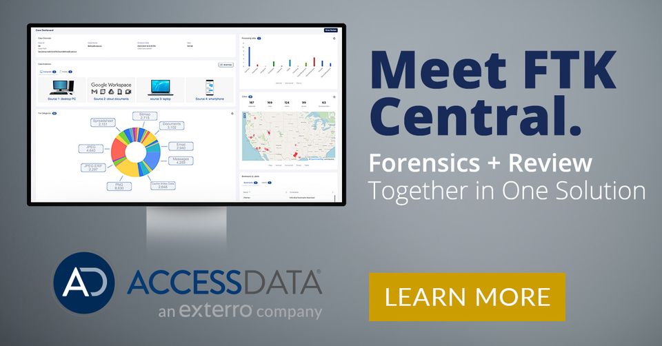 Exterro Inc., el proveedor preferido de software Legal GRC diseñado específicamente para los equipos internos legales, de privacidad y de TI en las organizaciones Global 2000 y AmLaw 200, anunció hoy el lanzamiento de Forensic Toolkit (FTK) Central, una plataforma única que une a la perfección Investigaciones forenses digitales y flujos de trabajo de revisión para abordar los desafíos legales de GRC de principio a fin. FTK Central combina el potente motor de procesamiento de FTK, líder en la industria, con nuevos e innovadores flujos de trabajo forenses y de revisión para todos los niveles. El resultado son recopilaciones forenses aceleradas, producciones de documentos, investigaciones y revisiones internas, y procesamiento de nivel forense confiable, repetible y escalable, todo en una única solución colaborativa basada en la web.