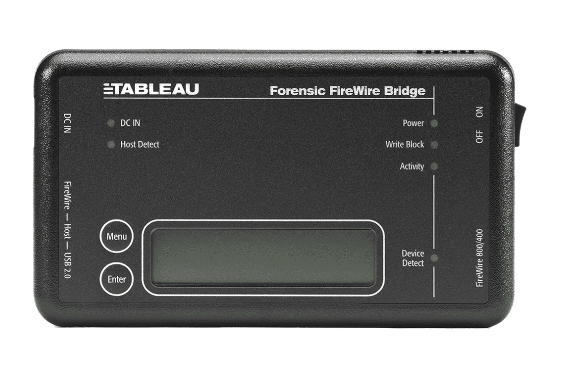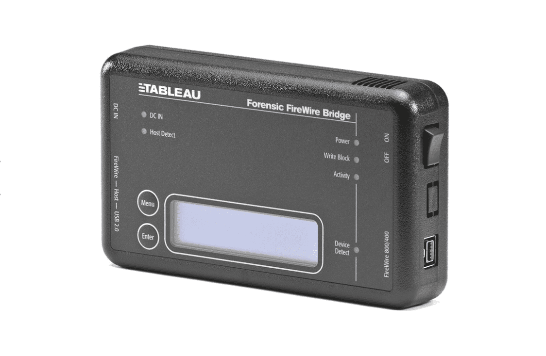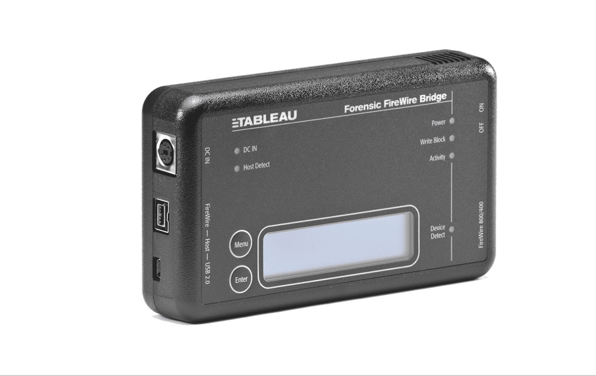 Tableau Forensic FireWire Bridge es un bloqueador de escritura portátil que permite la adquisición forense de dispositivos de almacenamiento FireWire800 y FireWire400.