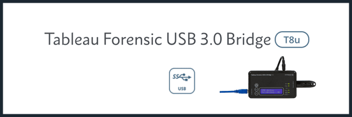 El T8u USB 3.0 de Tableau Forensic es un bloqueador de escritura portátil que permite la adquisición forense de dispositivos USB 3.0. Un producto de Tableau de segunda generación, que reemplaza al Tableau T8-R2.