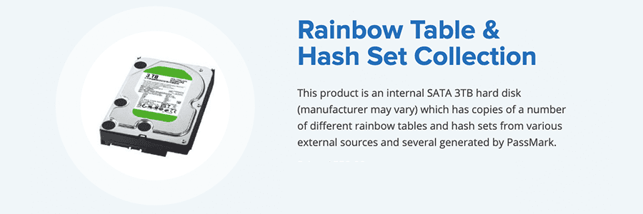 Este producto es un disco duro interno SATA de 3 TB (el fabricante puede variar) que tiene copias de diferentes tablas de arco iris y conjuntos de hash de varias fuentes externas y varias generadas por PassMark.